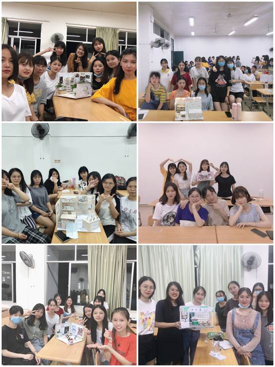 在本学期的《会展英语》课上,同学们已经了解过展会的基本知识、学习了参展角色、展位类型及如何设计、搭建展位,并且将课堂所学进行实践,以小组的形式设计了自己的“公司”及“参展商品”,发挥各自的想象力和创造力,制作出了精美的展位模型。来到课堂上,同学们在老师的引导下,先进行了展位接待礼仪、接待用语的培训,了解了接待顾客时要注意的事项。接着各小组以展位模型为依托,扮演“参展商”的角色,接待由老师和学生代表扮演的“顾客”,用英文介绍各自公司情况及产品。30分钟模拟结束后,“顾客”们根据“参展商”们的服务用语、产品介绍情况、提供的服务及展位设计进行评分,两次活动共选出6个最优秀展位。