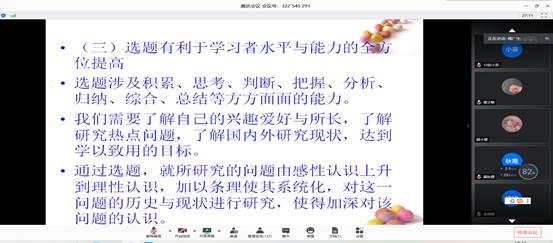 为了顺利推动学院论文指导工作,加强学生的论文选题能力,6月18日晚,我挍首席教授傅广生博士受邀在腾讯会议给语言文学学院2017级学生和论文指导教师开展了毕业论文选题的线上讲座。