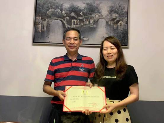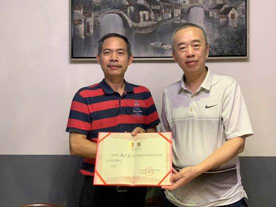 图:杨树喆校长为语言文学学院首席教授傅广生颁发聘书