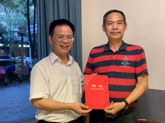 图:杨树喆校长为语言文学学院首席教授谢世坚颁发聘书