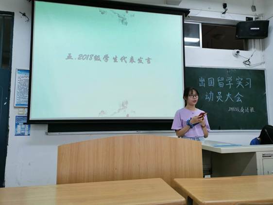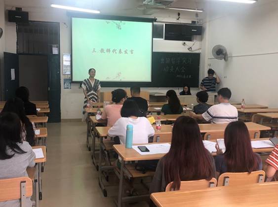 会上,泰语教研室教师代表石亿老师发言时嘱咐学生们一定要注意安全,珍惜机会,努力学习,祝愿学生们能乘风破浪,归来仍是少年。2018级学生代表发言时表达了全体同学对学校和父母的感激,并保证要好好珍惜这次难得学习机会,恪守大学生的行为准则,不违法乱纪,为国争光,为母校争光。2016级泰语专业的学长代表也发来了寄语,对即将出国的学弟学妹们表达了由衷的祝贺,并分享了自己的留学心得——保持信心,勤奋刻苦。随后,班级纪律委员宣读了经大家讨论而制定出的班规,保障大家在泰国留学实习的顺利进行。语言文学学院何玲院长为本次大会作总结发言总结,希望2018级全体同学一定要珍惜这难得机会,努力学习,认真实践,并从安全、学习、实习、生活等五个深方面对大家提出了要求和指导,最后预祝2018级泰语专业全体同学学业有成,满载而归。