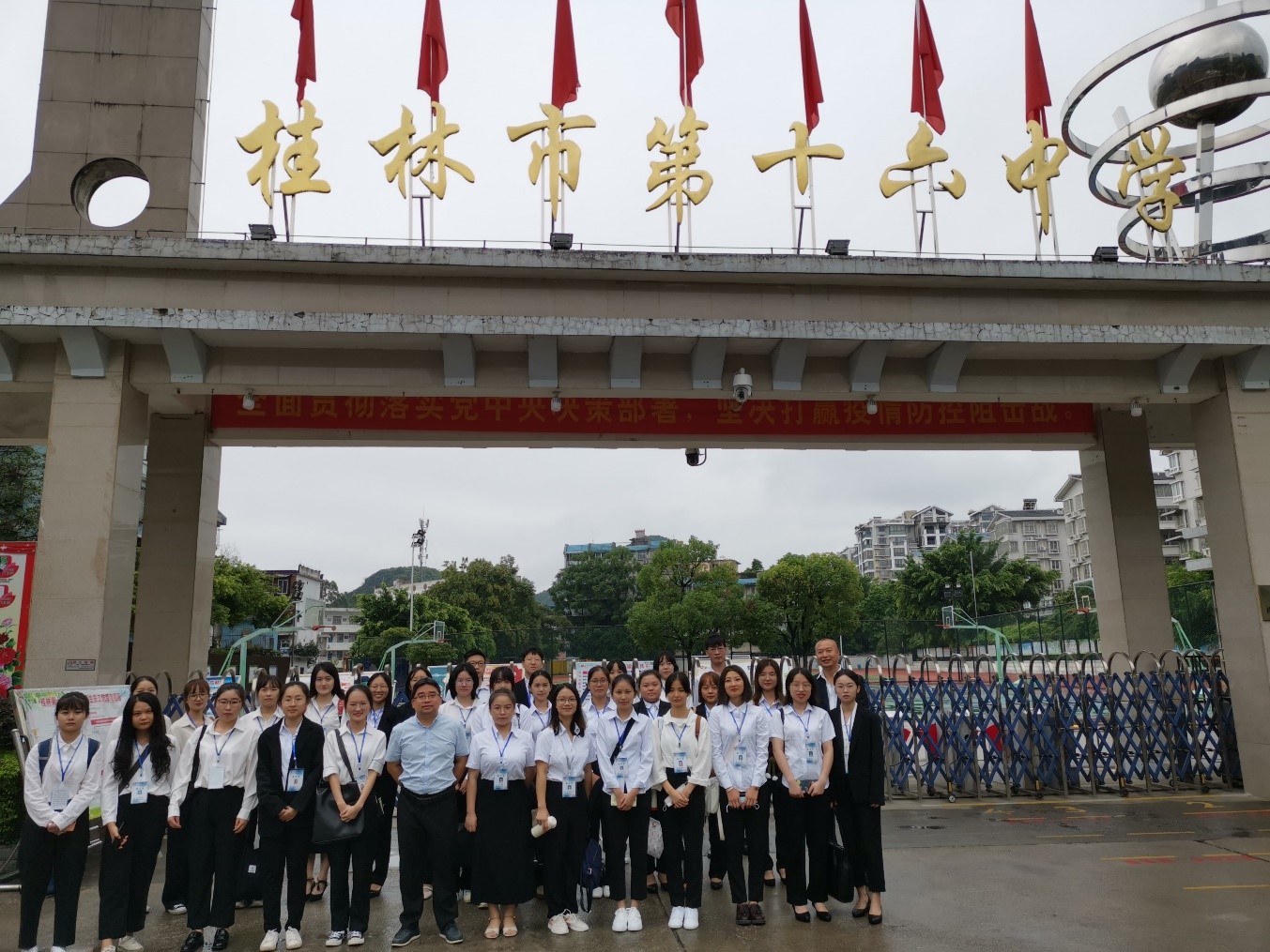 2020年9月21日星期一上午时分,伴随着萧瑟清爽的秋风,校车搭载着实习生,到达了瑰丽的南溪山畔。实习生们出了车门,在两名带队老师曾强、唐让操老师的带领下,缓缓前行。步行数十米后,映入眼帘的,便是一扇耸立的中学校门。桂林市第十六中学,建校至今已有38年之久,是桂林出名的老牌中学。实习生与两名带队教师,在桂林市第十六中学的校门前合影留念——在接下来的三个月内,这些实习生们,将在桂林市第十六中学内,学习老教师们丰富的教学经验和班级管理经验,努力关怀所负责的每一名学生。实习生们将在这三个月的历练中受益,他们立志,他们将成为一个个合格的、优秀的实习教师。