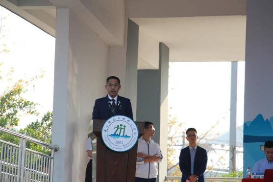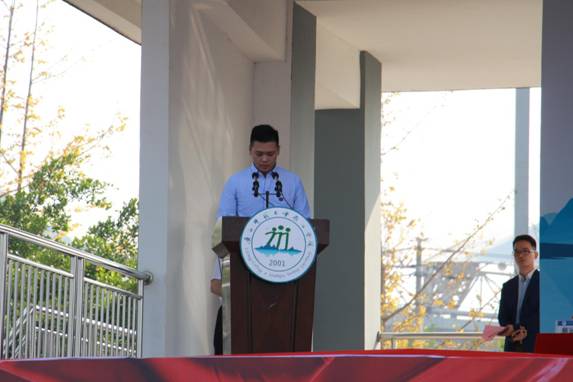 典礼在庄严的国歌声中拉开序幕。首先由杨树喆校长发表致辞,向新生介绍学校基本情况,并向新生提出期望和要求:一是希望新生尽快适应大学生活,在大学期间加倍努力学习,不要松懈。二是期望同学们要学会自律自省,不要沉迷于游戏,被身边的诱惑所影响。三是要培养团队合作精神,学会互帮互助。最后,杨树喆校长以一首自创古体诗《七律·喜迎漓院建校二十年头》作为结语,希望新同学们高举“至善”精神火炬,点燃拼搏激情,在未来四年的大学生活中尽情书写无悔的青春乐章。