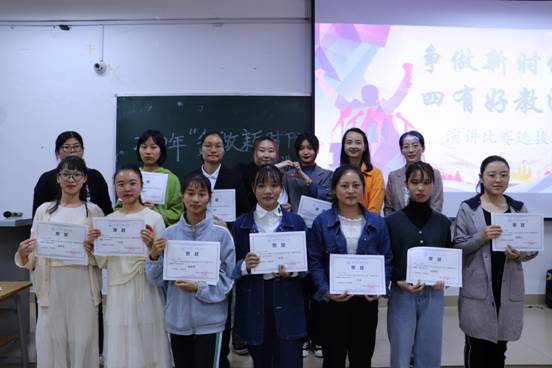 比赛开始,参赛选手们都在赛前做好了充分的准备,并紧紧的围绕主题,结合身边的优秀教师和新时代教师模范,从不同的角度,不同的层面阐述了对“四有”教师的理解。选手们的演讲声情并茂、语言流畅,声音洪亮,紧扣时代脉络,得到了观众的掌声与好评。赛后,陶学文主任对此次大赛进行点评,陶老师指出,演讲者要围绕主题阐述自己对主题的理解,要有手势和形态的协调,并且演讲选手的演讲主题突出,语言流畅。欧炼芬老师指出,选手们能够结合身边的优秀教师诠释了对“四有”好教师的认识,并希望同学们能够通过“四有”好教师的标准来严格要求自己,朝着四个方面努力,成为一个合格、优秀的好教师。最后,获得本次演讲大赛的一等奖是2018级翻译A班刘北兰同学,2018级翻译B班杨佳轩和2018级英语三班李婷婷获得二等奖,2019级商务英语陈凤金等三名同学获得三等奖,及2018级翻译B班王飒等五名同学获得优胜奖。