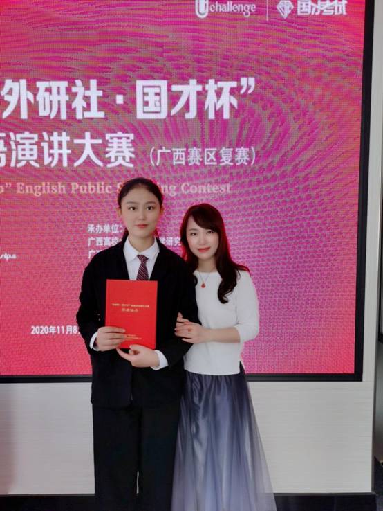 根据2020“外研社杯”全国英语演讲比赛组委会有关文件精神要求,广西区高校大学外语教学研究会于2020年11月8日在广西大学第一教学楼举行“外研社·国才杯”全国英语演讲比赛广西赛区复赛。我校2018级英语专业学生袁咏仪、2018级商务英语专业学生林天祥在区级复赛中表现优异,分别获得广西赛区复赛二等奖、三等奖。