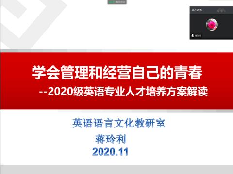 为帮助新生更进一步地了解英语专业,做好目标规划。11月6日晚在腾讯会议上进行英语专业解读会。本次讲座由英语语言文化教研室主任蒋玲利老师主持,2020级英语专业的全体学生参加此次讲座。