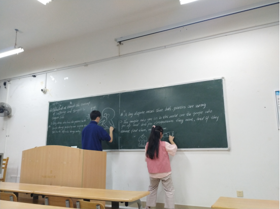比赛由粉笔书写和粉笔作画方式进行。参赛者在限定的时间里即席挥毫。主持人宣布比赛正式开始后,30位选手开始纷纷上场进行比赛。来自英语专业不同年级的30位选手各展才能,共同为观众们献上了一场赏心悦目的书画盛宴。