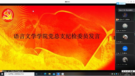 语言文学学院党总支根据《党章》和《党支部工作条例》的有关规定,于2020年12月2日晚7:30在腾讯会议召开党员大会选举总支纪检委员,会议由组织员杨恋主持,大会应到会169人,实到会119人,因公因课程请假50人;有选举权正式党员70人,实到会61人,因公因课程等原因请假9人,符合党员大会召开的规定。