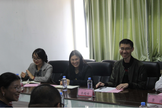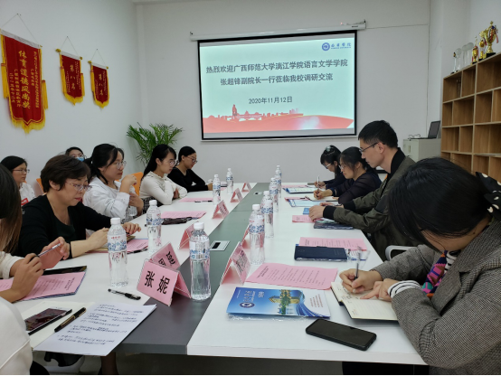 调研第二站是广西民族大学相思湖学院,外国语学院院长朱文宣、副院长陆凯等老师接待了我校教师。外国语学院朱院长、陆副院长分别就课程设置、课程编排、第二课堂、语音室建设和基础学科竞赛等相关工作进行了介绍,之后双方特别就大学英语现阶段所面临的机遇和挑战如大学英语课程软硬件建设、一流课程建设、现代教育技术应用环境下教学方法和技能的提升、线上线下混合教学模式、课程思政以及大学英语四、六级过级率提升等方面进行了深入的交流和探讨。