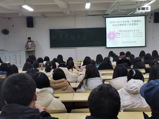 时光飞逝,日月如梭,2020-2021学年第一学期即将结束。2021年1月10日,语言文学学院2020级汉语言文学专业召开了“2020-2021学年第一学期期末总结会暨寒假工作布置会”。