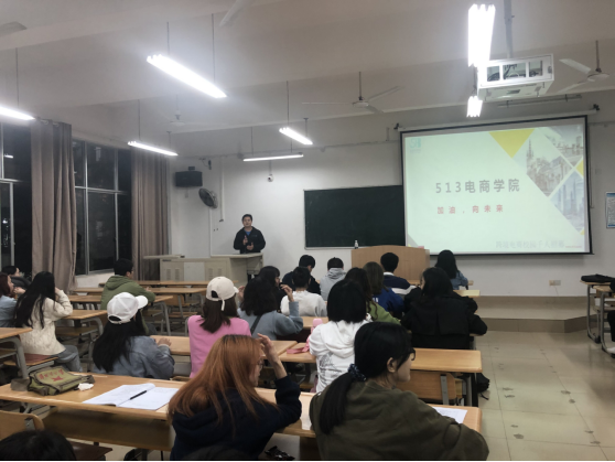 最后,周晓峰老师向同学们展示了跨境电商的职业优势和电商学院的五个成长定位、一个理念以及三个初心,向同学们介绍513平台的实习就业项目“渔人计划”。他告诉同学们,这是一个全新的互联网时代,电商的价值和发展趋势非常可观。
