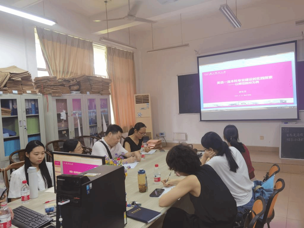 5月14日下午,教育部高等学校外国语言文学类专业教学指导委员会英语专业分委员会委员、广西高校英语教学指导委员会副主任委员、广西师范大学外国语学院院长、博士生导师谢世坚教授受邀为我校教师作题为“英语一流本科专业建设的实践探索——以师范院校为例”的专题讲座。本次讲座由语言文学学院大外第一教研室主任黄文敏老师主持,语言文学学院各教研室教师代表参加讲座。
