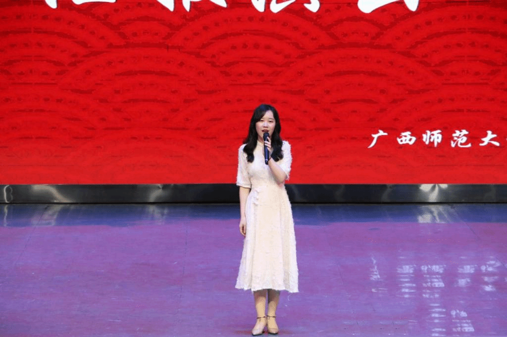 活动伊始,语言文学学院副院长陈锴老师上台讲话。她赞扬了陈秀芬老师与谢索菲老师对学生的辛勤教导,同时肯定同学们对学习广西文场曲艺文化的认真与坚持并呼吁大家一起弘扬非遗曲艺文化。