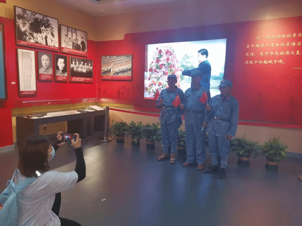 图为语言文学学院志愿者在纪念馆内为群众拍照留影