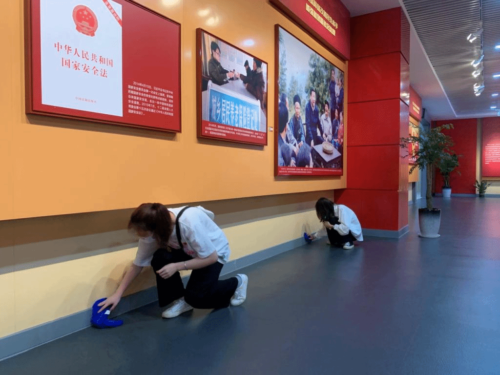 图为语言文学学院志愿者在馆内擦展示墙灰尘