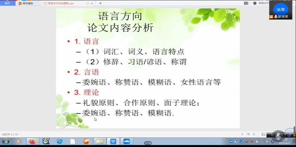 2021年6月6日晚上7到9点,我校语言文学学院英语专业教师蒙洁琴和罗桂温老师在腾讯会议上召开了2018级学生毕业论文选题系列讲座。