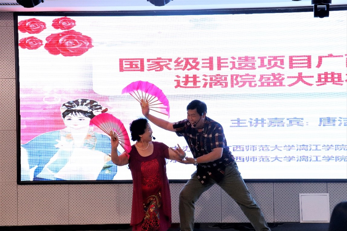9月7日,国家级非物质文化遗产项目广西壮族自治区彩调代表性传承人唐洁、桂林市代表性传承人李剑敏受邀到桂林学院(原广西师范大学漓江学院)进行讲座和表演。本次讲座载歌载舞、别具风格,深深吸引了在座的英语、越南语、泰语、商务英语、国际汉语教育等外语专业和师范类专业的师生们。