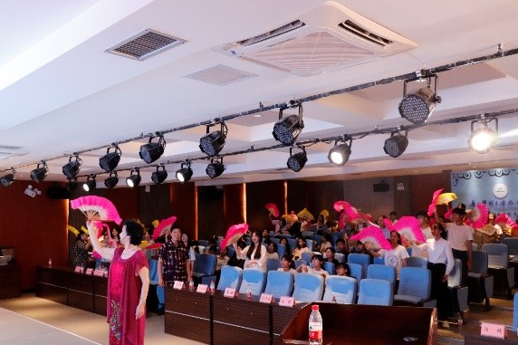 彩调是广西的一种地方戏剧,是广西城乡流传最广、最有乡土味的剧种,唐洁老师为彩调的保护和传承不懈努力了40多年。唐老师首先通过讲座,介绍了彩调的形式,包括一人表演的独角戏、两人一问一答表演的对子调、三人表演的三小戏(小生、小旦、小丑)。然后,她指出彩调音乐分为四种,如腔、板、调以及民间小调。彩调不仅有丰富的唱腔300首,有扇花类、步法类、指法类、手绢花、高桩、中桩、矮桩等多种身段,而且还借用文场的南词、丝弦等。唐老师边讲边演唱不同腔调,展示其特色,令人印象深刻。在谈到彩调是“快乐剧种”时,唐老师和李老师演绎了国家级非物质文化遗产项目广西彩调表演,如《挑女婿》、《四门摘花》、《王三大鸟》、《刘三姐》等彩调剧片段。最后,唐老师讲解了“彩调三宝”彩扇、彩带和手帕,给现场的师生传授绣球扇、滚球扇、砍扇等扇子的表演方式。