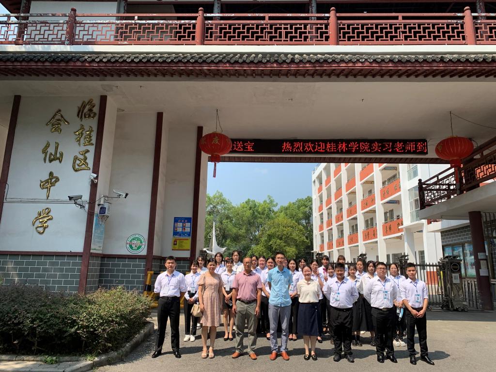 骄阳似火,金秋挽桂,2021年9月13日语言文学学院2018级汉语言文学专业、英语专业的32名同学在满怀期待中奔赴临桂区会仙中学,开展为期12周的教育实习工作。带队老师分别为学院副院长张超锋、专任教师周婕、罗桂温。