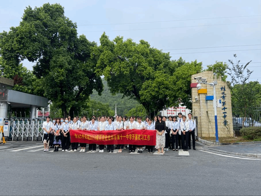 2021年9月15日上午,语言文学学院2018级学生在我院陈锴副院长、李丽群老师和黄艳丽老师的带领下,前往桂林市十一学开始为期12周的教育实习活动。