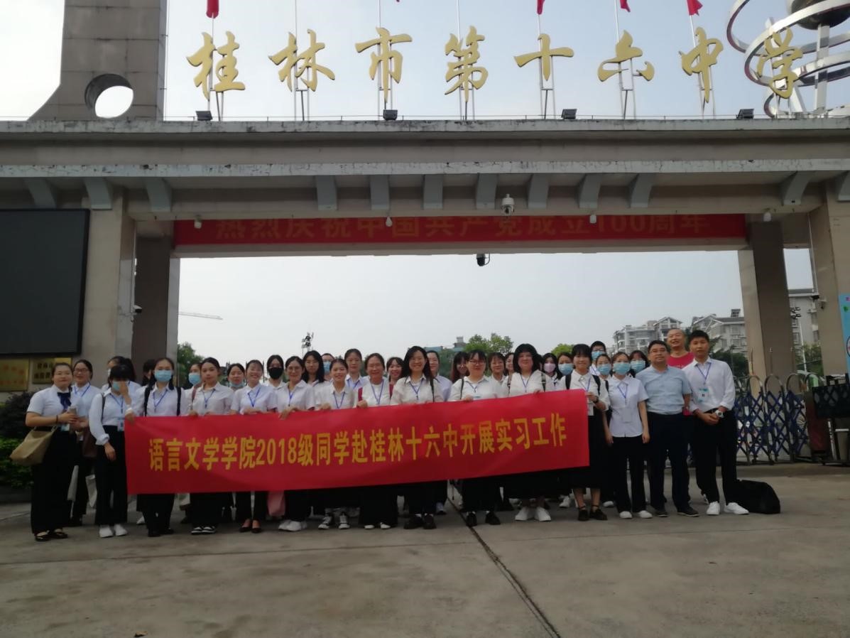 为落实做好2018级汉语言文学专业教育实习工作,我院根据专业人才培养方案安排,需进行为期12周的教育实习工作。2021年9月13日至9月15日,语言文学学院2018级汉语言文学专业实习生在学院领导老师们的带领下,陆续奔赴各实习点,正式开启了教育实习工作。实习点涵盖了桂林八中、桂林十一中、桂林十六中、任远学校、雁山中学、会仙中学、六塘中学、阳朔漓江中学、阳朔福利中学、葡萄初中、广福中学、罗锦中学、百寿中学、东江学校、苏桥初中、白沙中学、高田民族中学等实习学校。