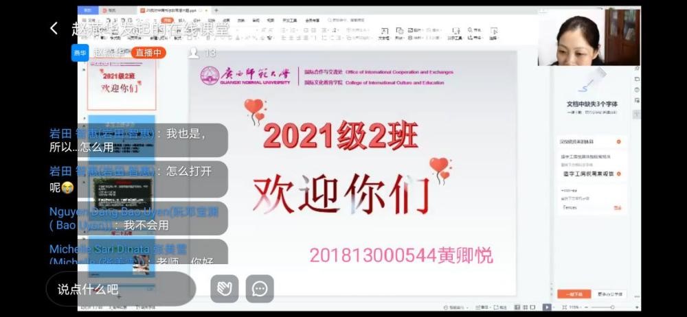 开学第一周,在广西师范大学国际文化教育学院老师们的指导下,同学们认真观摩参与指导老师们的精彩在线课程,与留学生在汉语课堂中互动,课后与留学结成“语伴”,激发他们对中国语言和文化的兴趣,开展线上答疑解析活动,帮助留学生学习汉语。