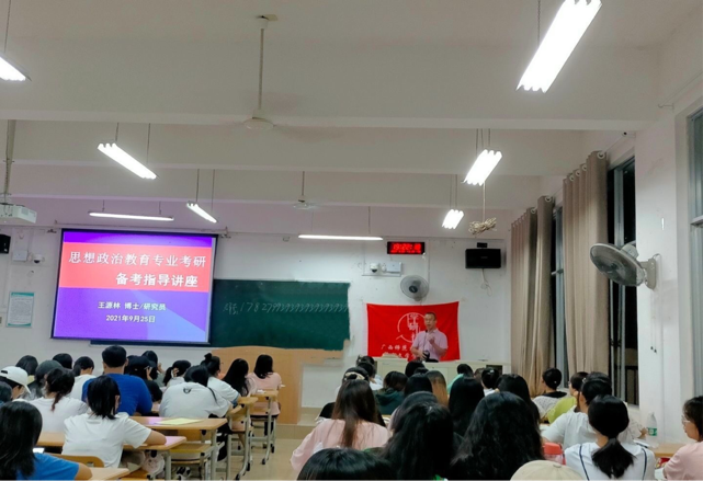 为了让跨专业考研学生能够坚定考研信心、了解考研方向、明确考研目标,2021年9月25日晚上7点,我校桂林学院语言文学学院学研社在1208教室以“跨专业考研新方向——思想政治教育专业备考”为主题举办了一场精彩的考研辅导讲座。本次讲座由知名高校的王教授担任主讲,讲座吸引了学研社全体成员以及对跨专业考研有兴趣的同学们纷纷前来听讲。