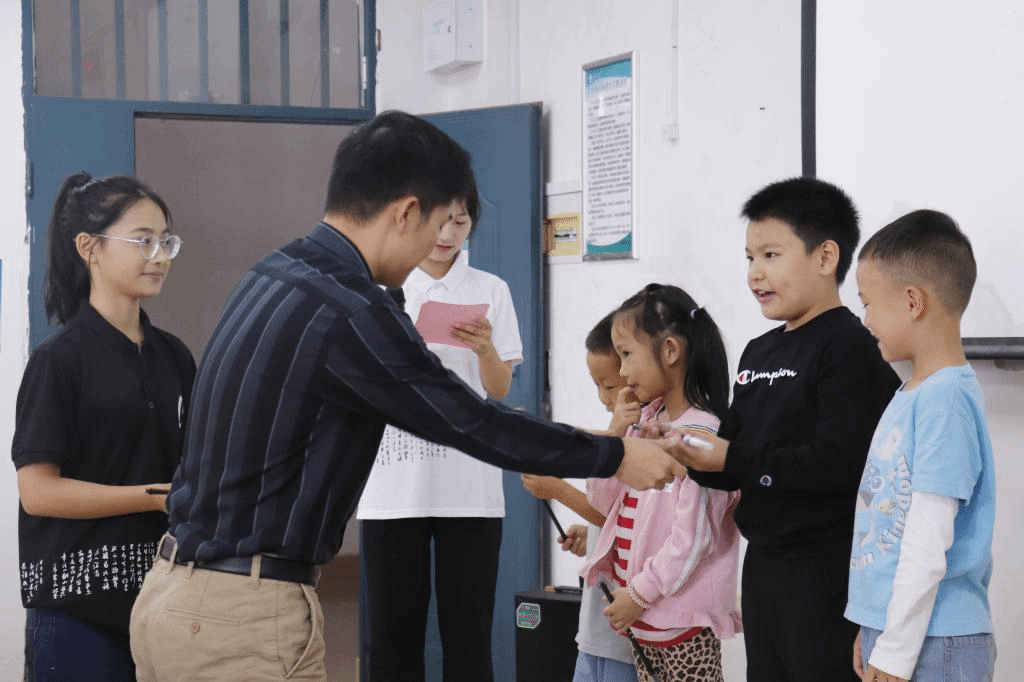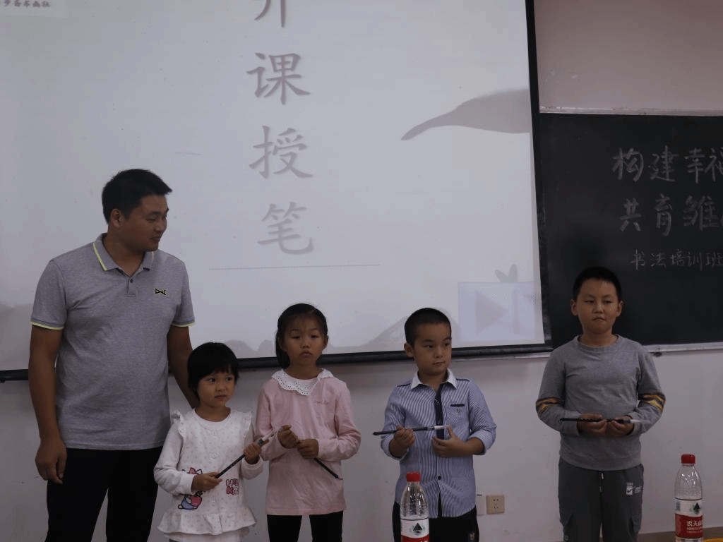 授笔仪式。李久华处长和江仿书记分别对小朋友们进行了授笔,寓意小朋友接过手中的笔,开启书法的精彩世界,书写未来,书写精彩的人生。