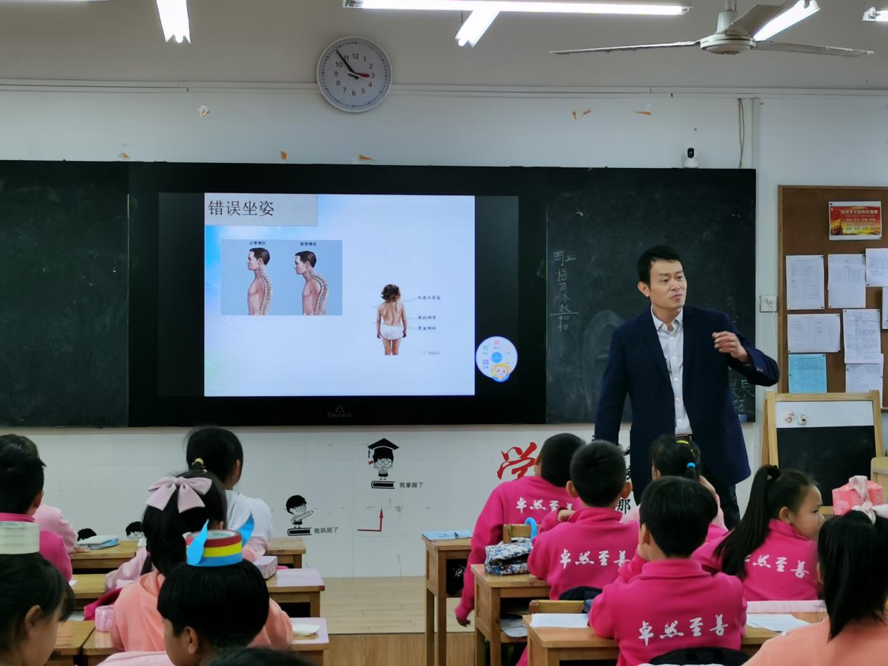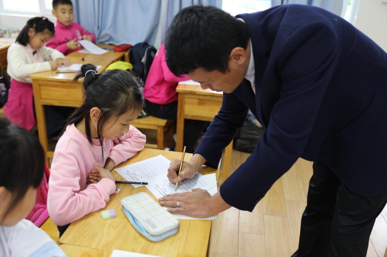 图:杨杰夫老师带领小朋友学习正确的书写姿势