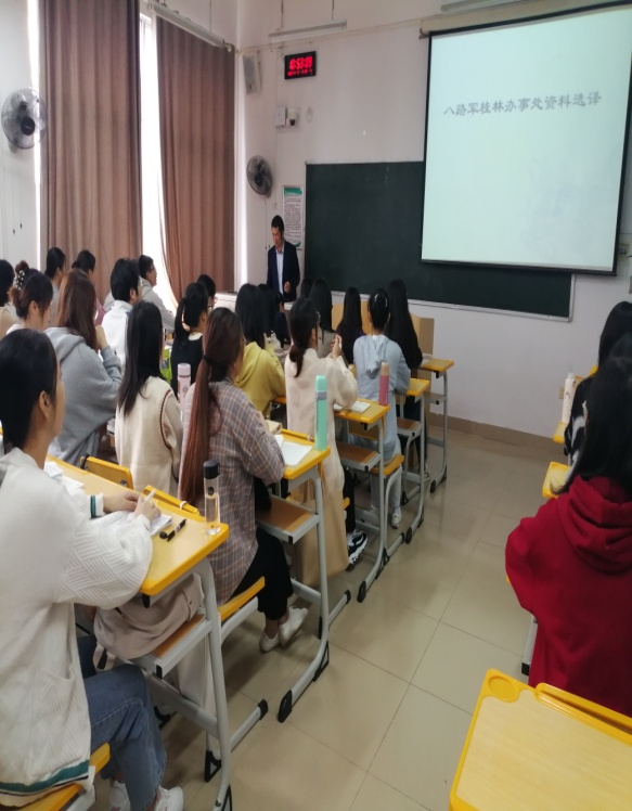 活动中,泰语专业姚垚老师以视频和文字的形式向大家展示了八路军桂林办事处的建立背景、历史和作用,并带领学生们将八路军桂林办事处相关内容进行了翻译。课上,学生们将自己所学到的翻译理论与技巧用于课堂实践翻译中,精彩的译句频频出现,课堂气氛好,育人效果佳。最后,学生们纷纷表示要感恩革命先烈,珍惜幸福生活。