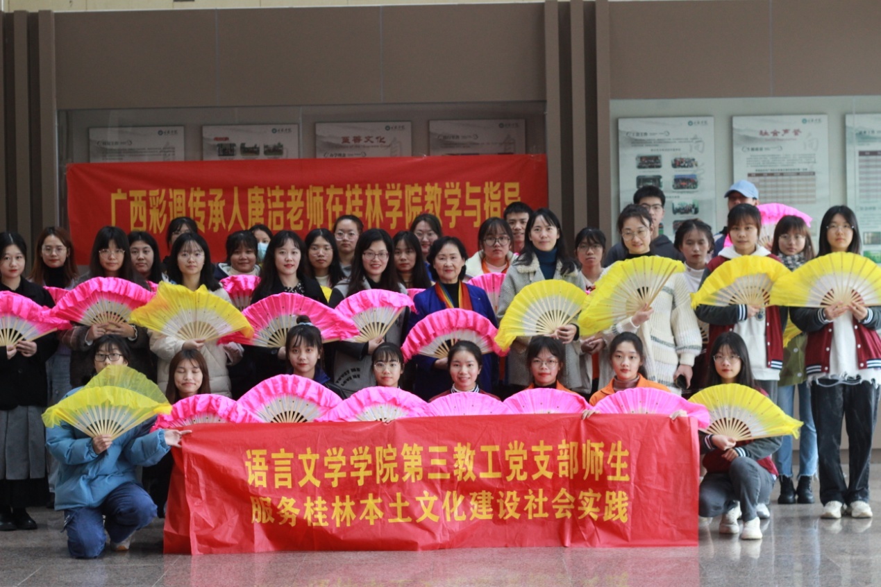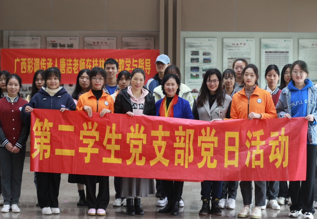 2021年11月17日,语言文学学院第二学生党支部与第三教工党支部在学校二楼大厅共同开展主题为“非遗传承,推进桂林地方文化建设”的主题党日活动。此次党日活动邀请了国家级非遗项目彩调传承人唐洁老师进校授课,旨在传承与传播中华民族优秀传统文化,推进桂林地方文化建设。