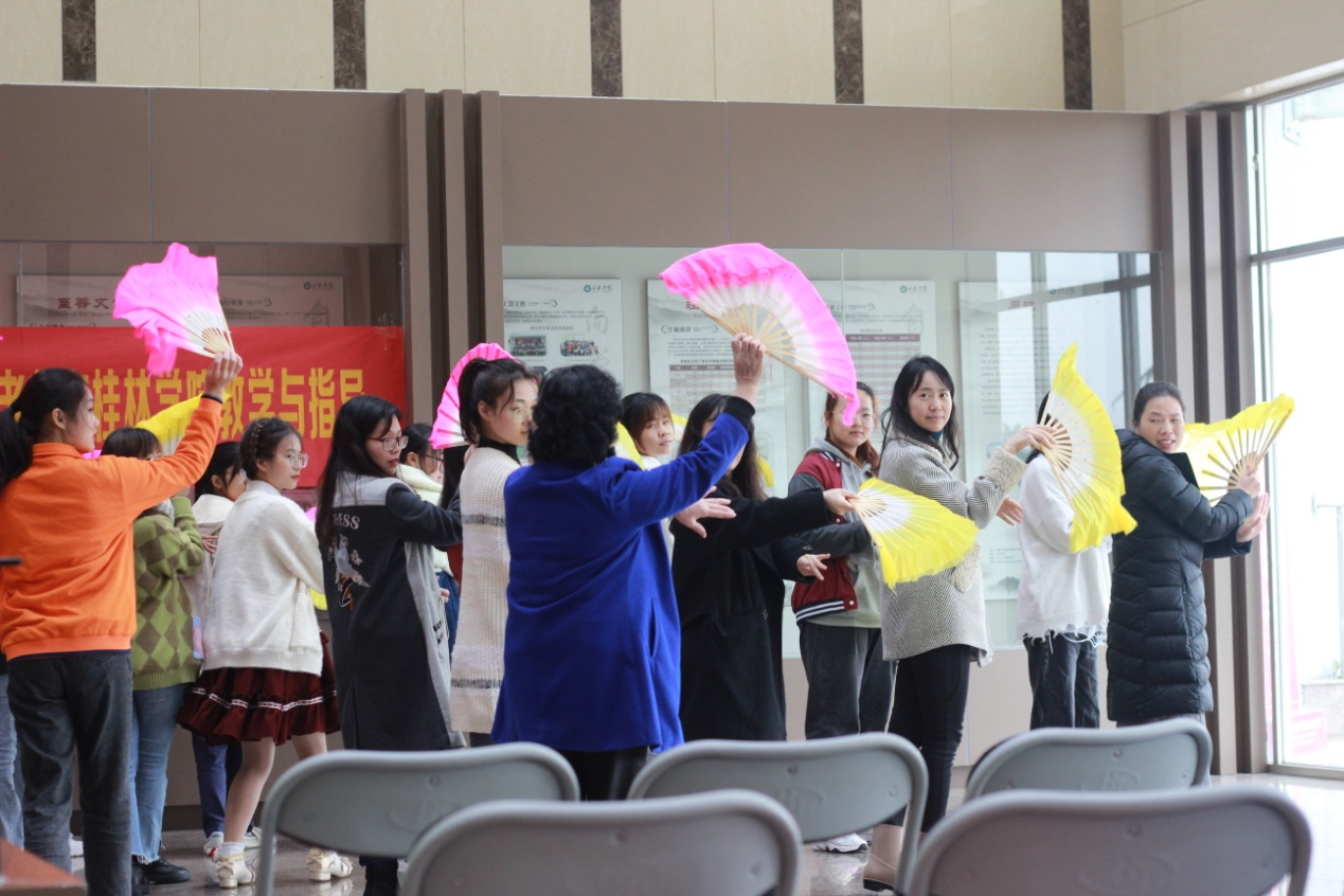 活动开始之前,第三教工党支部党员代表赵莉莉老师介绍了国家级非遗项目彩调传承人唐洁老师及彩调的相关情况。接下来唐洁老师带领大家现场学习了彩调的动作及唱腔。活动中,唐洁老师激情展示,老师与同学们认真学习,气氛活跃而有趣。最后,第二学生党支部书记石仁春老师对活动进行了总结,提出希望学习外语的同学在学好自己专业的同时,把中国优秀传统文化传承与传播出去。