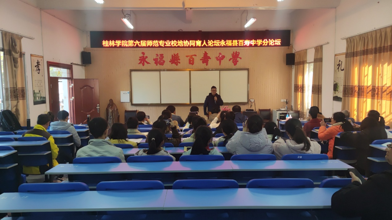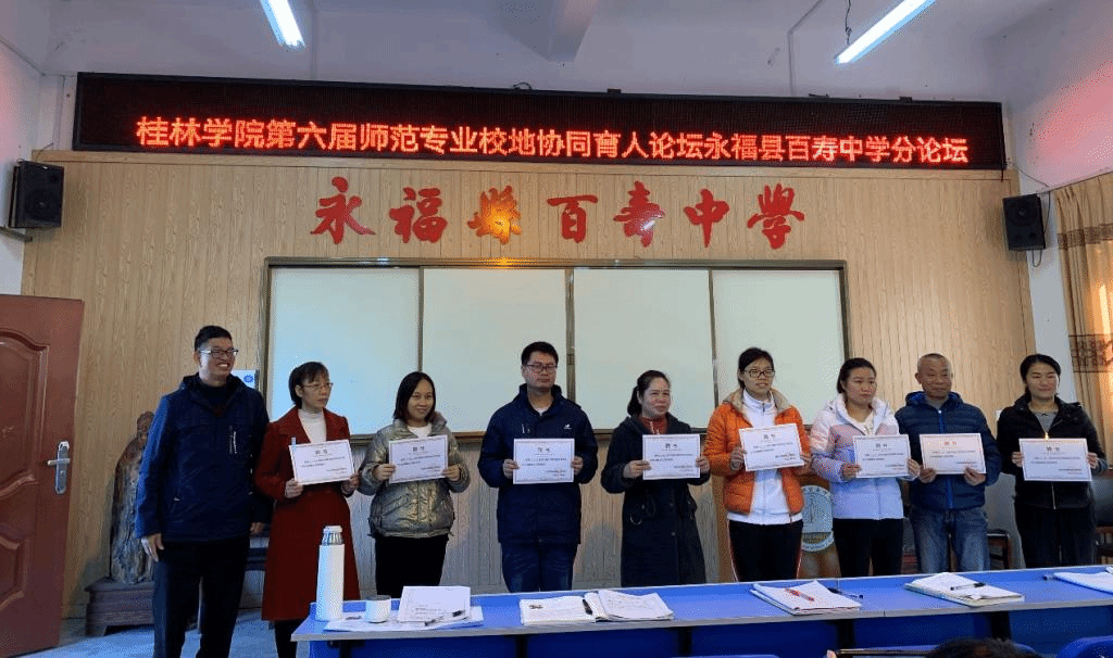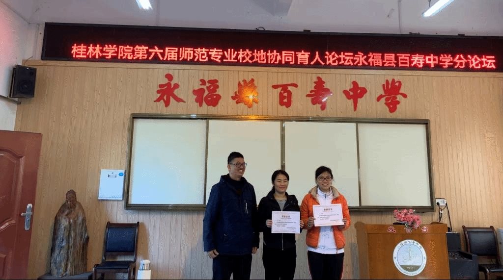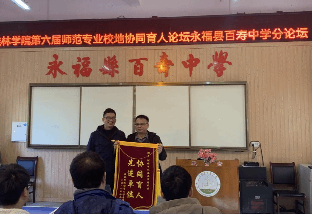 活动的最后,在永福县百寿中学江菊芬副校长的主持下,潘冠海教授为两位授课老师颁发荣誉证书,并对各位实习生的指导老师、班主任、黄富渊校长、何世光书记颁发聘书。同时,永福县百寿中学对桂林学院“协同育人”活动的开展给予高度支持,为表谢意,我院特为百寿中学颁发锦旗。