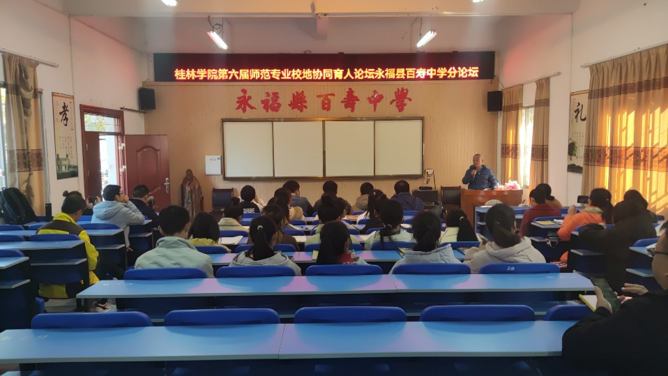 我院潘冠海教授、赵强副教授与邢政老师到场检验实习生实习成长实践成果,永福县百寿中学语文组全体老师参加活动,我院2018级汉语言文学百寿中学实习点全体实习生在现场听课学习。