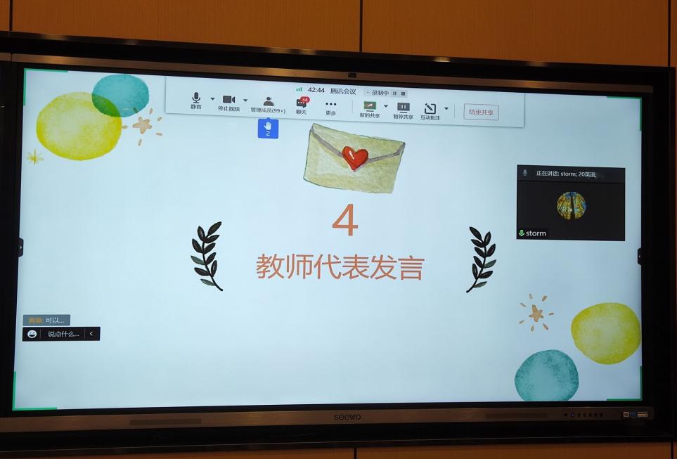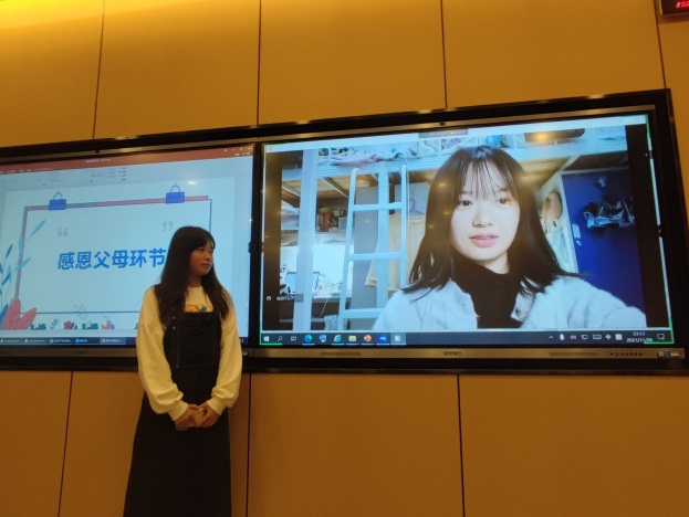 第一环节:辅导员讲解环节。介绍本年级专业的基本情况:2020级英语专业一共9个班(8个英语教育班,1个英语翻译班)共有240人。闭老师讲解了英语教育和翻译这两个方向的学分情况以及学校的管理制度,其中包括每周晚例会、学生宿舍检查、严格住宿管理制度、疫情防控制度和课堂考勤等多项制度,让家长们对学校管理制度有了更深的了解。第二环节:教师代表发言环节。荣幸邀请到语言文学学院副院长张超峰老师和语教师教育教研室主任陆海峡老师。张超峰老师谈到:“大学或许并不像我们想像的那样浪漫悠闲,当你处于大学之中,你会时而无助,时而疲惫,但这就是我们要吃的苦头”。这句话告诉我们家长以及孩子,大学并不是青年人享受的地方,而是一个让人成长的地方。陆老师也说到:“大学里,当你忙起来就不会有闲的时间,学会合理安排自己的时间去充实自己”。听完两位老师的发言,家长们和同学们都深有感触。同时,还邀请了两位家长代表发言。家长们的发言也让同学们知道:父母永远是孩子们坚强的后盾,孩子们只需要好好把握和珍惜现在。意在鼓励我们同学们勇往直前,与老师共同创造美好的校园生活!第三环节:各班展示环节。各班都为家长们精心准备了感恩视频展示,希望通过视频来跟家长们分享丰富的大学生活,更重要的是表达对父母的感恩之情。各班展示视频通过记录在校的住宿、饮食以及各种有趣的课堂课外活动,让远在一方的父母感到放心;也通过真情表白视频来表达对父母的爱与感恩,让深爱着同学们的父母感到骄傲与自豪。