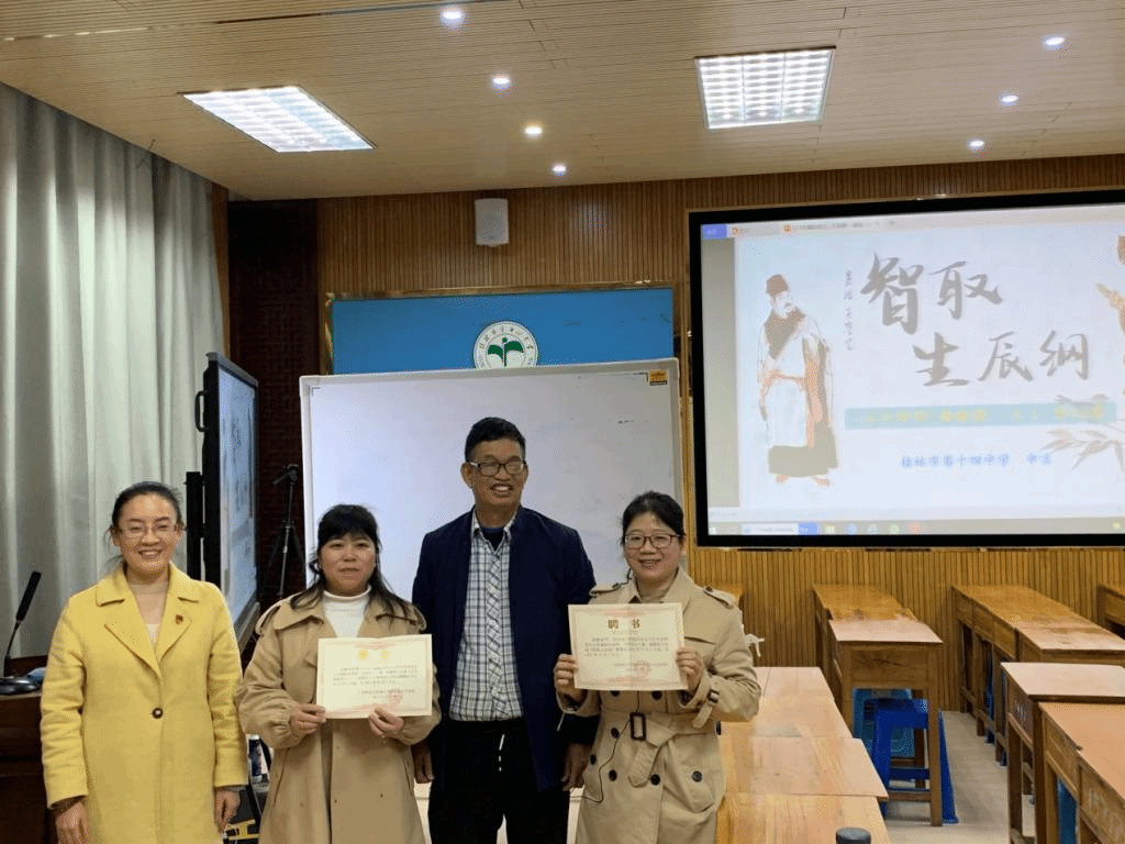 最后,由潘冠海教授做了评课。他首先对十四中对桂林学院对这次活动大力协作表示感谢,并对这次授课教师授予聘书。潘教授针对在“双减”背景下,就语文教育教学提质增效策略与提升中学一线教师理论素养关系,对在场的初中语文教师做了一场学术报告。潘教授的讲座,既有理论性,又有可操作性,同时结合自身的教育教学经历,分享了自己的教学经验,通俗易懂,形象生动。潘教授在讲话中指出:语文教学要根据语文课程的性质展开,根据语言文字的特点和人的思维规律开展教学,培养学生的思维能力,同时在教学中也要注重文体特点,根据文体特点进行教学。潘教授的讲座,十四中语文教师或益很多,李副校长给以很高的评价。