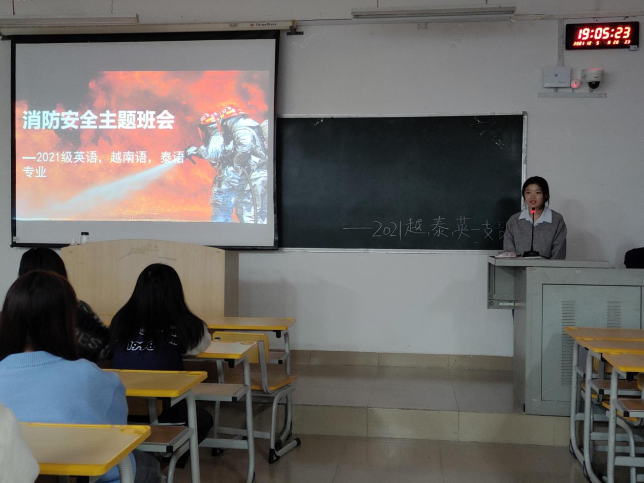 为全力打造平安校园,增长学生有关消防方面知识,进一步提高学生的消防安全意识和自防自救能力,语言文学学院2021级英语、越南语、泰语专业于12月5日晚开展了以“消防安全知识普及”为主题的班会活动。