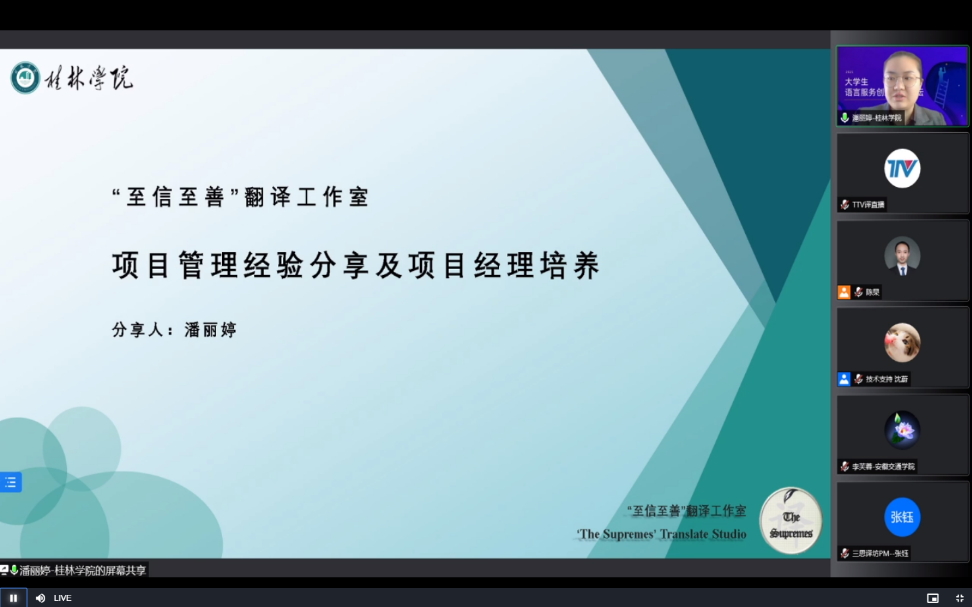 图:“至信至善”翻译工作室创始人潘丽婷进行线上分享