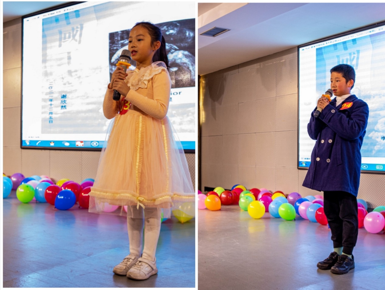 图:英文组3号选手谢欣然、4号选手谢浩然演讲