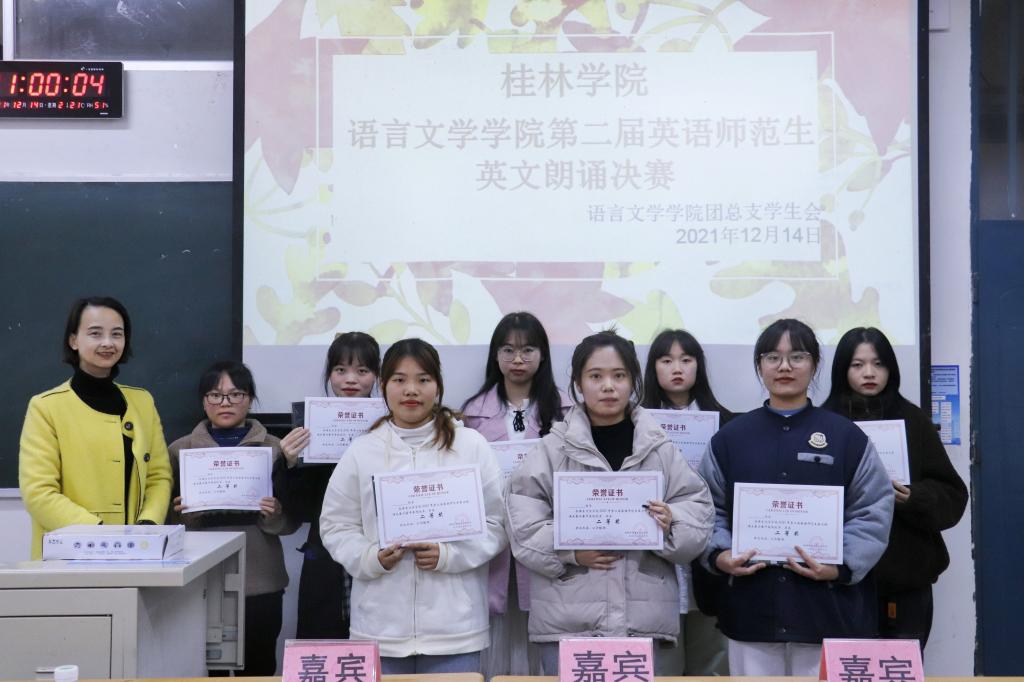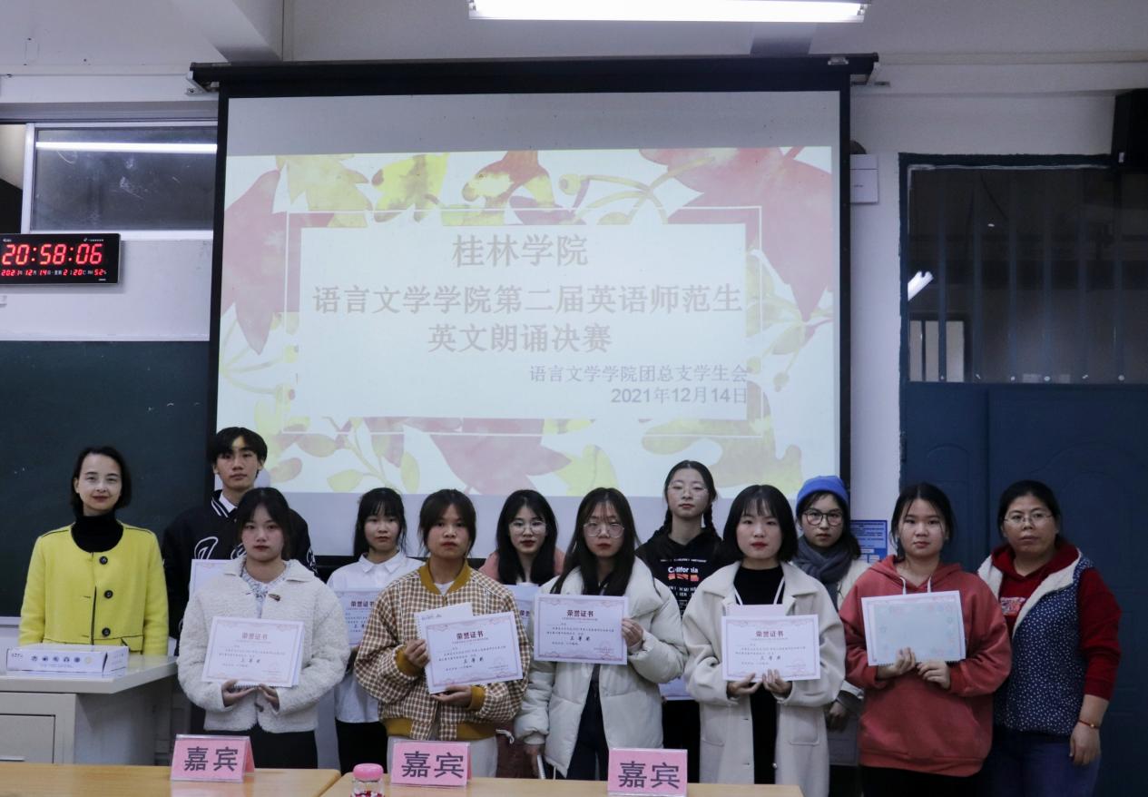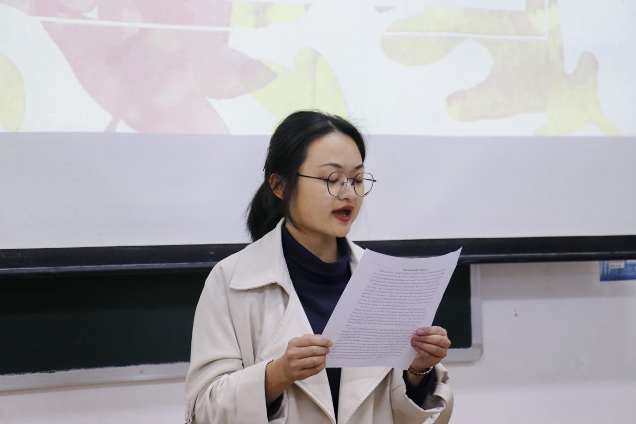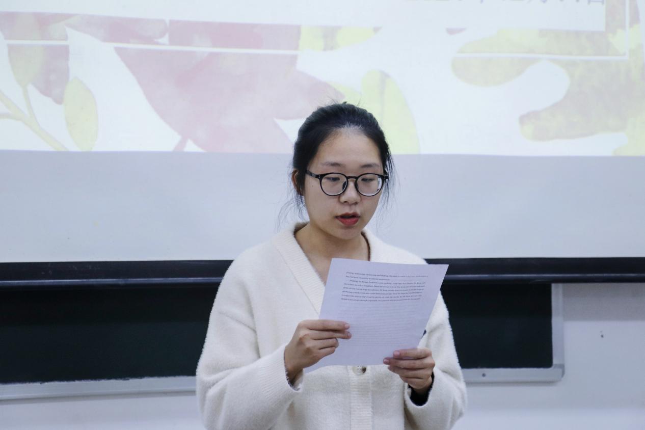 比赛伊始,由主持人宣布比赛规则。本次比赛主要针对选手的语言语调、感情气势、流利程度等方面进行考察,选手在赛前抽取朗诵文章,每次抽取时间间隔五分钟。比赛正式开始,选手们根据顺序依次上台朗诵。在比赛过程中,同学们展现了良好的英语朗诵能力,声音或沉稳柔和,或激昂澎湃,他们用不同的朗诵风格将一段段英语选文的情感演绎得淋漓尽致,不仅让在场的同学感受到语音的美、语言的力量,同时也展现了我院英语专业同学们扎实的专业基础。经过激烈的角逐,由包珊珊、陈崇千2位同学获得特等奖;王晓燕、黄晓月等5位同学们获得一等奖;郭玉佳、舒程等8位同学获得二等奖;张琦欣、韦柳英等10位同学们获得三等奖。最后,由韦珍妮同学为本次大赛作总结。她不仅充分肯定了选手们在比赛中的表现,同时作为大四的学姐,她还根据自身的实习经历给在场同学传授了学习经验,希望同学们在校期间能够努力学习专业知识,夯实自身的专业基础,提高专业能力,为将来走上教师岗位奠定基础。