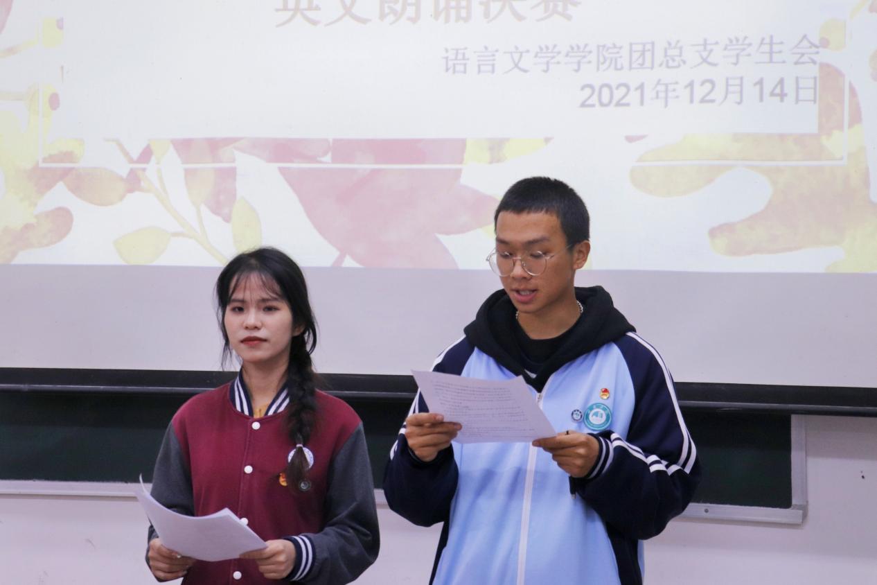 为了进一步活跃校园文化气氛,丰富同学们的课余生活,激发同学们学习英语的热情,提高英语专业同学们的英语口语水平和个人朗诵能力,12月14日,语言文学学院在至善楼1303教室举办了第二届英语师范生英文朗诵大赛。本次比赛由语言文学学院陆海峡老师、欧炼芬老师以及2018级韦珍妮同学担任评委,刘秋雨、郁长远两位同学担任主持人。