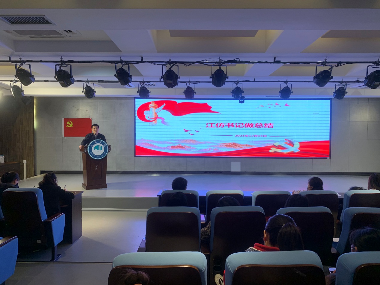 最后,语言文学学院党总支书记江仿对以上六名支部书记述职做总结,并就2021年语言文学学院党总支党建工作情况进行汇报。他指出,各支部汇报了一年来取得的成绩,也点明了存在的问题,述职评议考核是一次总结、展示,同时也是各支部相互比拼、学习和交流的良好平台。接着,他从“主要的工作及成效、党建工作的主要成果、工作中存在的问题和措施”三个方面展开做了详细汇报,并引用“时代是出卷人,我们是答卷人,人民是阅卷人”,指出在学校的党建工作中,全体党员是答卷人,学校师生是阅卷人,师生党员要团结全院师生凝心聚力,为第二个百年奋斗目标和学校转设评估提供思想保障。