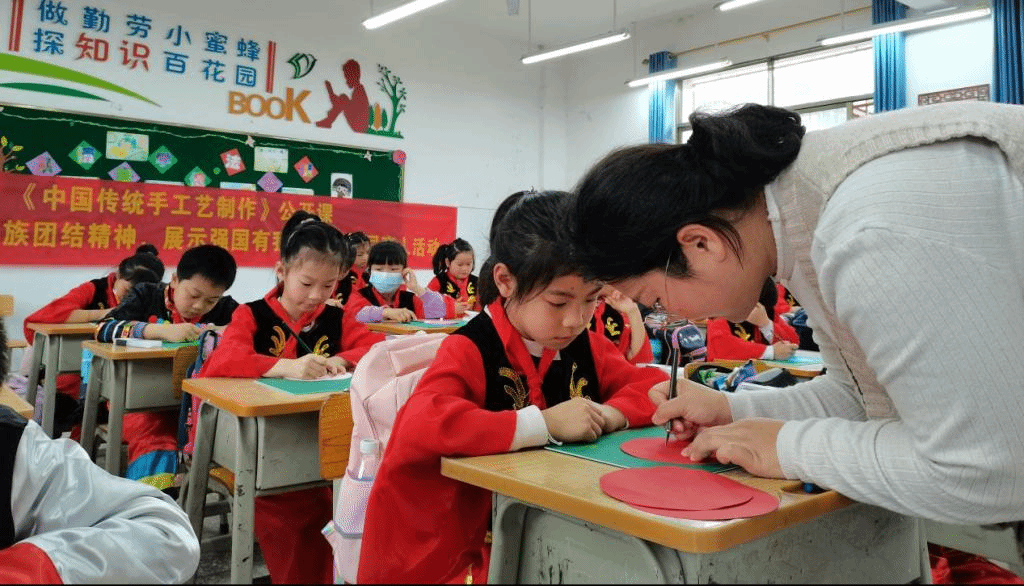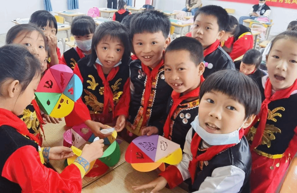 其次,在教学实践活动中,李晓蕾老师以手工制作民俗文化绣球为载体将中华优秀传统文化剪纸元素、党史故事、民族团结的内涵注入其中,引导学生在回望历史、关照现实、开创未来中成长成才。除此以外,还邀请桂林石画非遗传承人吕珊蔚、邓凤竹老师为学生们带来不一样的石画体验。
