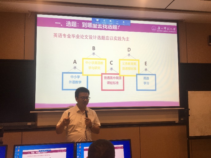 为了促进英语专业毕业论文(设计)指导工作的顺利开展,提高指导的科学合理性,语言文学学院邀请了广西师范大学研究英语教学的专家朱神海博士对本院全体英语教师做了关于如何改进英语专业毕业论文(设计)指导工作的讲座。