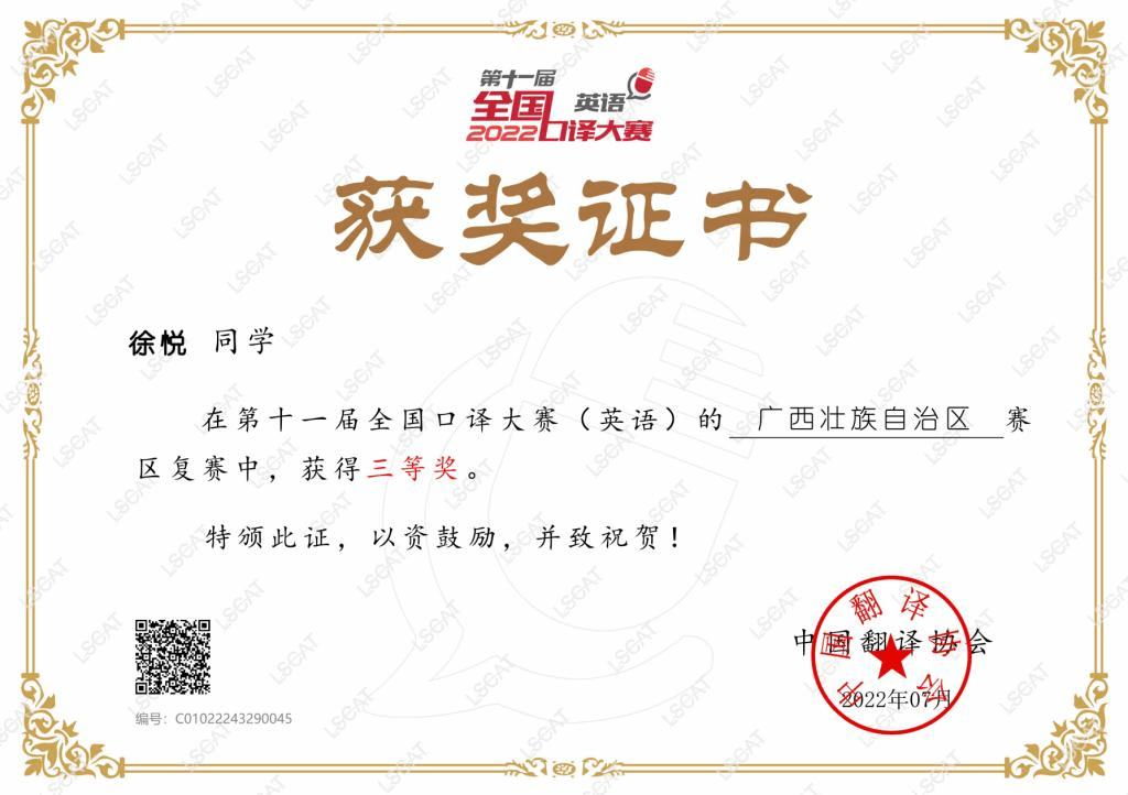喜讯:我校学子在第十一届全国口译大赛广西区赛中获得三等奖