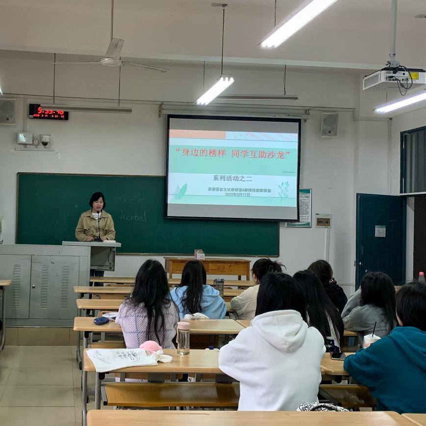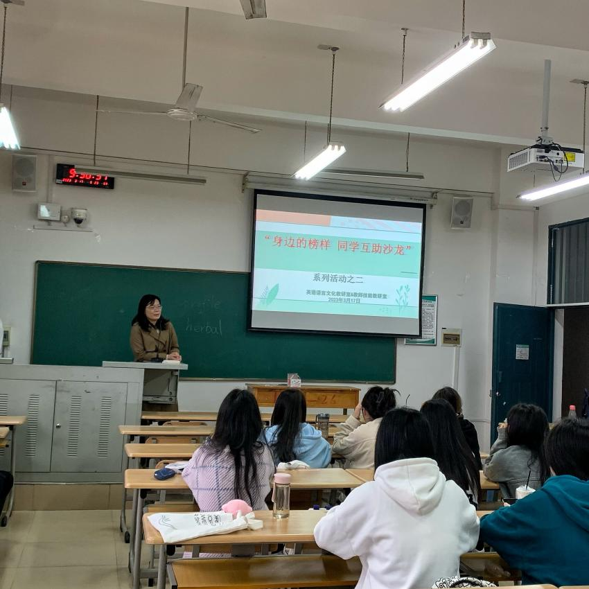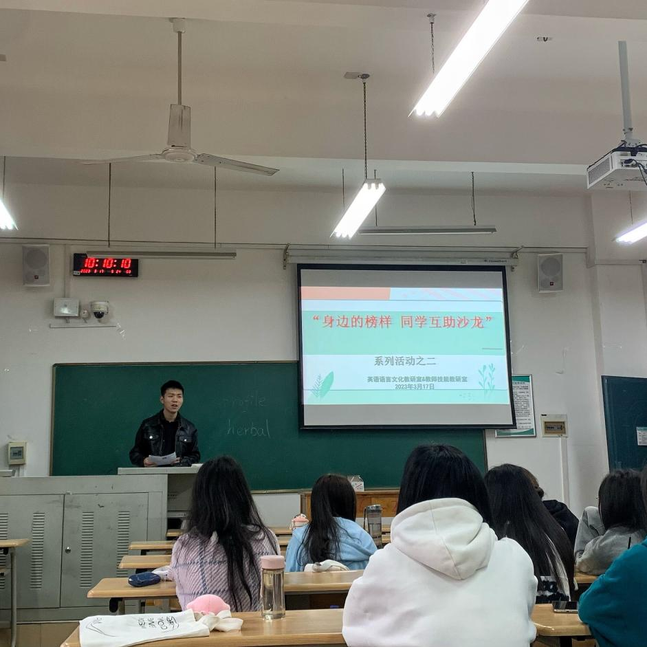 “身边的榜样,同学互助沙龙”系列第二次活动于2023年3月17日上午9:50-10:30在至善楼2501教室顺利展开。本次活动由人文学院英语文化教研室和教师技能教研室联合组织举办,邀请了2020级的陈恩林和孙亚鑫两位优秀同学给2022级英语1班和5班的同学介绍社团活动及语法助教经验、教师资格证备考经验。活动由黄彦立老师主持,罗桂温老师出席了活动并发表了讲话。