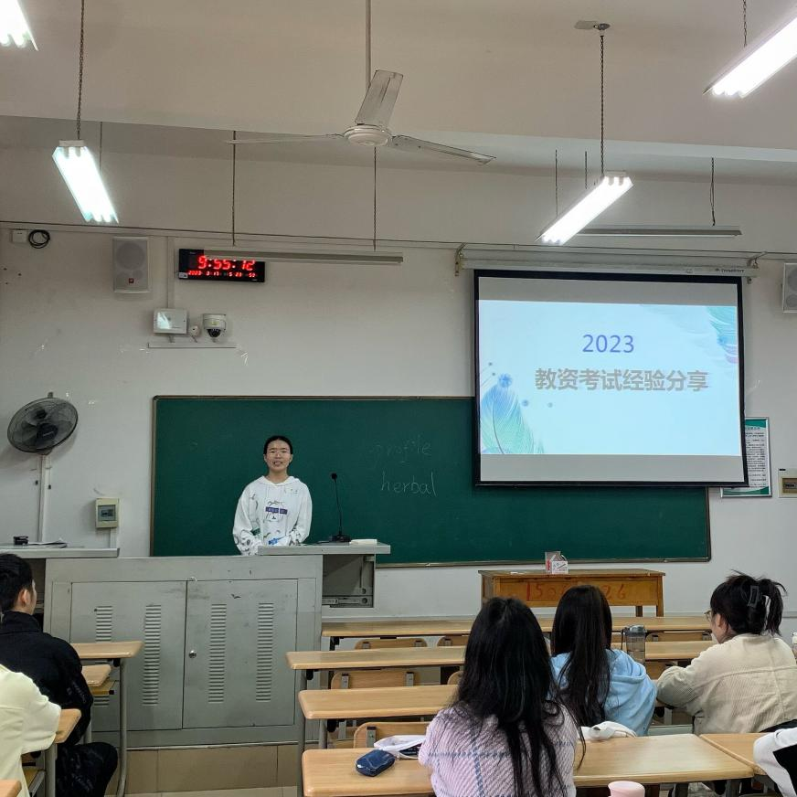 接着由孙亚鑫同学向同学们分享了“教资考试经验”。她从教资考试的题型分类、参考资料的选用、备考的时间安排、面试的注意事项等方面详细介绍了备考必备知识,给大家提出了许多实用的建议。