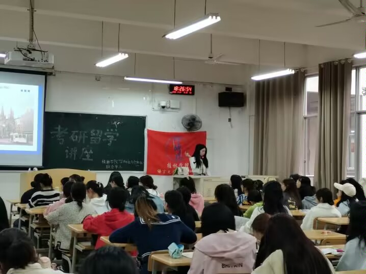 为了进一步加强学生对考研留学的了解,桂林学院人文学院学研社与知行社特别邀请商务英语教研室陈玥老师于2023年3月24日晚在桂林学院1208教室开展了以“2023年考研留学”为主题的讲座,此次会议的目的在于帮助同学们解决考研留学上遇到的问题。