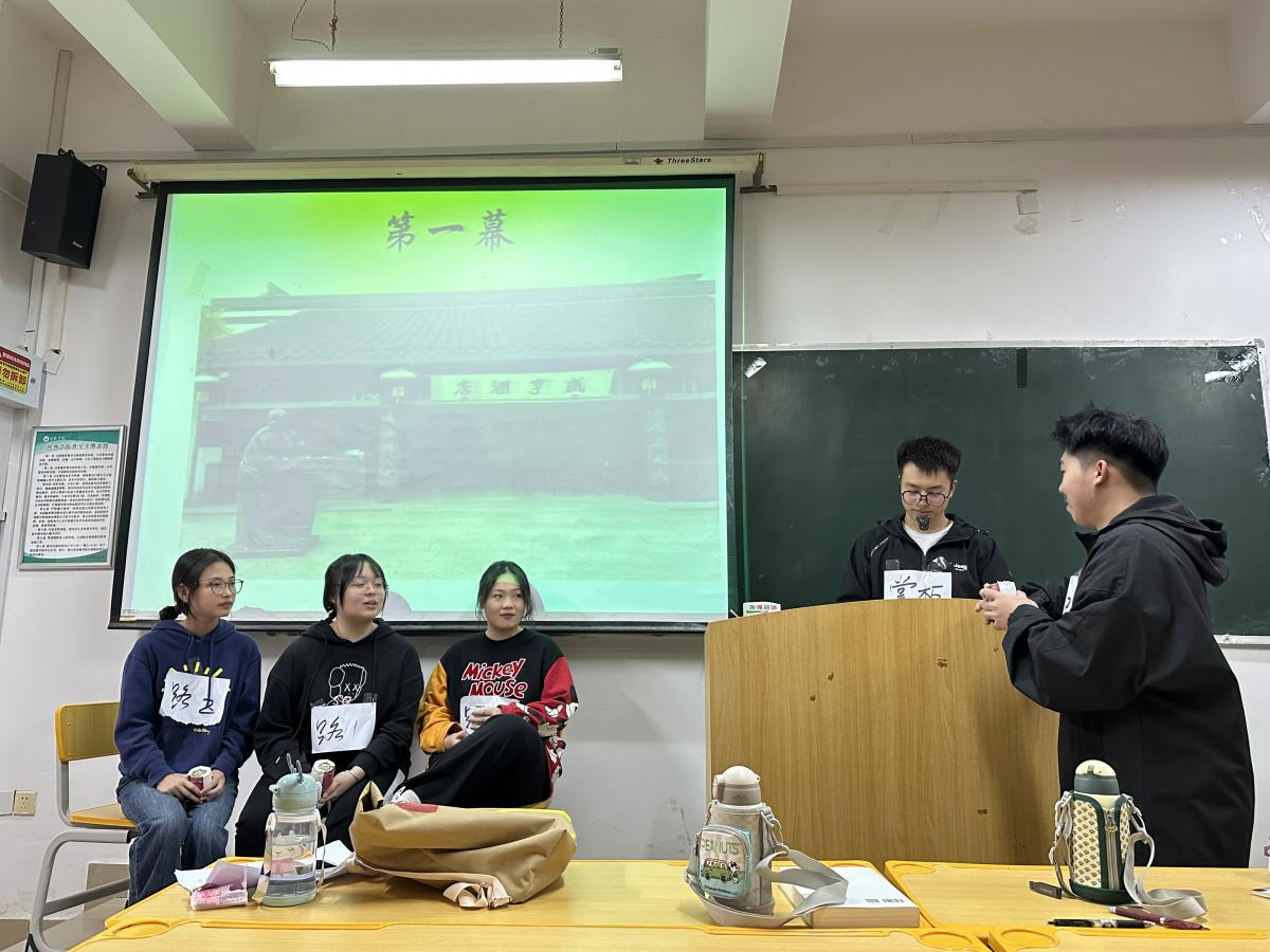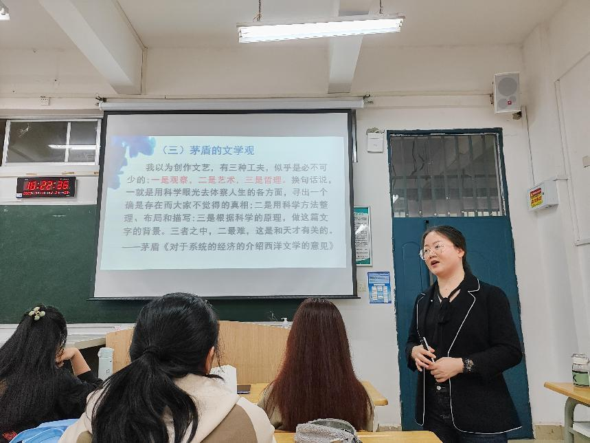 本次公开课活动,由主讲老师周婕向2022级汉语言文学专业同学,讲授《中国现代文学》第十章“茅盾专题”内容。在理论知识讲解过程中,适当融入“课程思政”相关内容,并阐明茅盾以自觉创造革命文学的理论和实践来建立、发展、完善中国现代小说,其艺术气质精细沉稳,是具有开放的中国民族心理的现代作家,也是一位创造时代典型与宏伟叙事体式的左翼文学大师,激发了学生的创新精神与爱国热情。之后,对茅盾经典长篇小说《子夜》的赏析,也增进了学生对现实主义艺术创作方法的认识。在课间休息间隙,学生小组根据经典小说《孔乙己》进行戏剧改编,增加了师生之间的交流与互动。