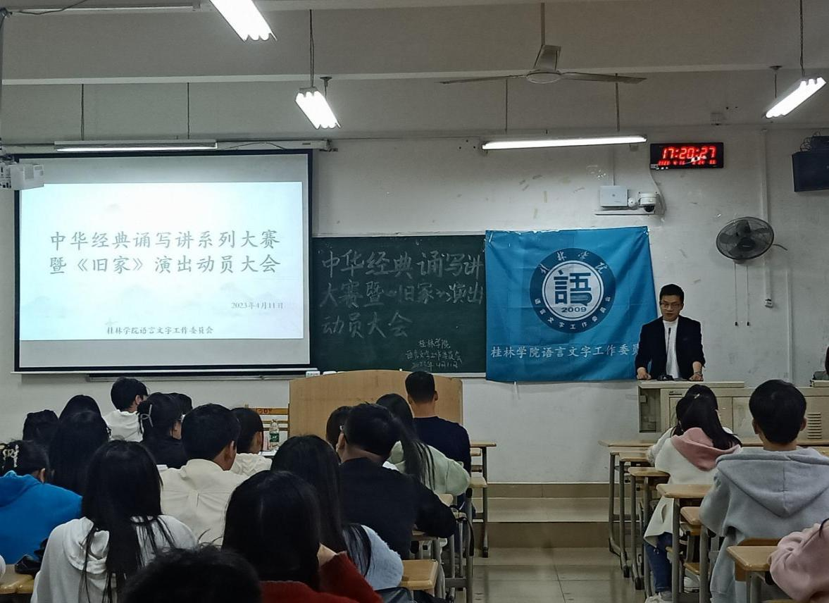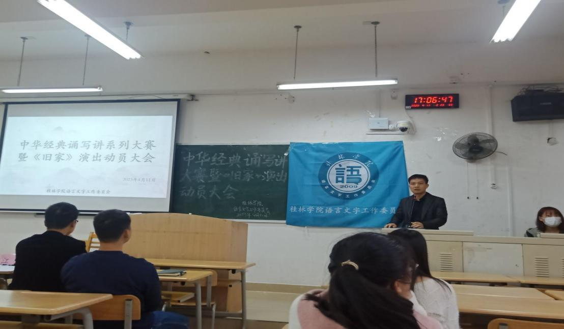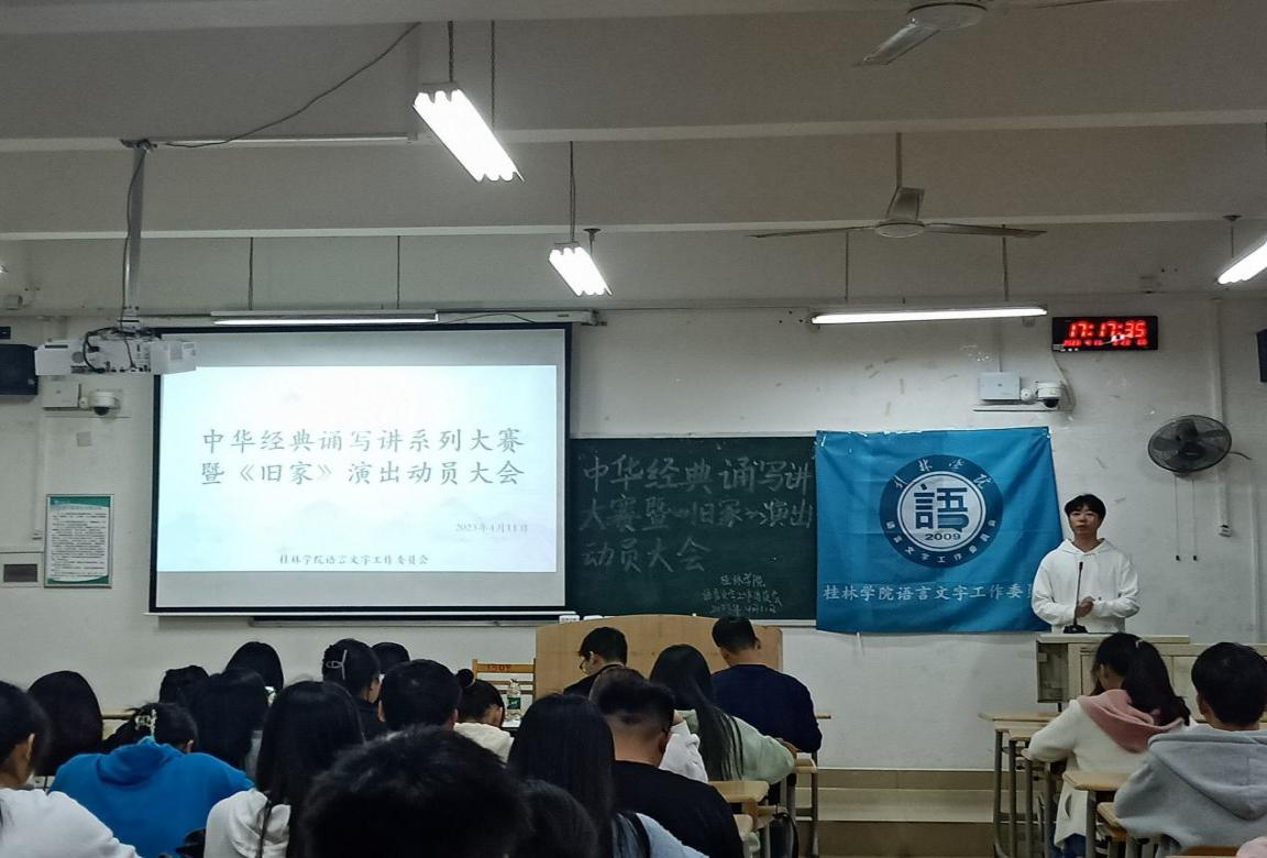 为贯彻落实党的二十大精神,加大国家通用语言文字推广力度,深化全民阅读活动,传承弘扬中华优秀语言文化,推进文化自信自强,依据历届广西区中华经典诵写讲系列大赛相关文件精神,4月11日,我校语委特召开桂林学院第二届中华经典诵写讲系列大赛暨《旧家》演出动员大会。人文学院书记江仿副教授,校语委指导老师钟锟、夏润泽和邓克鹏以及校语委全体学生参加了本次活动。